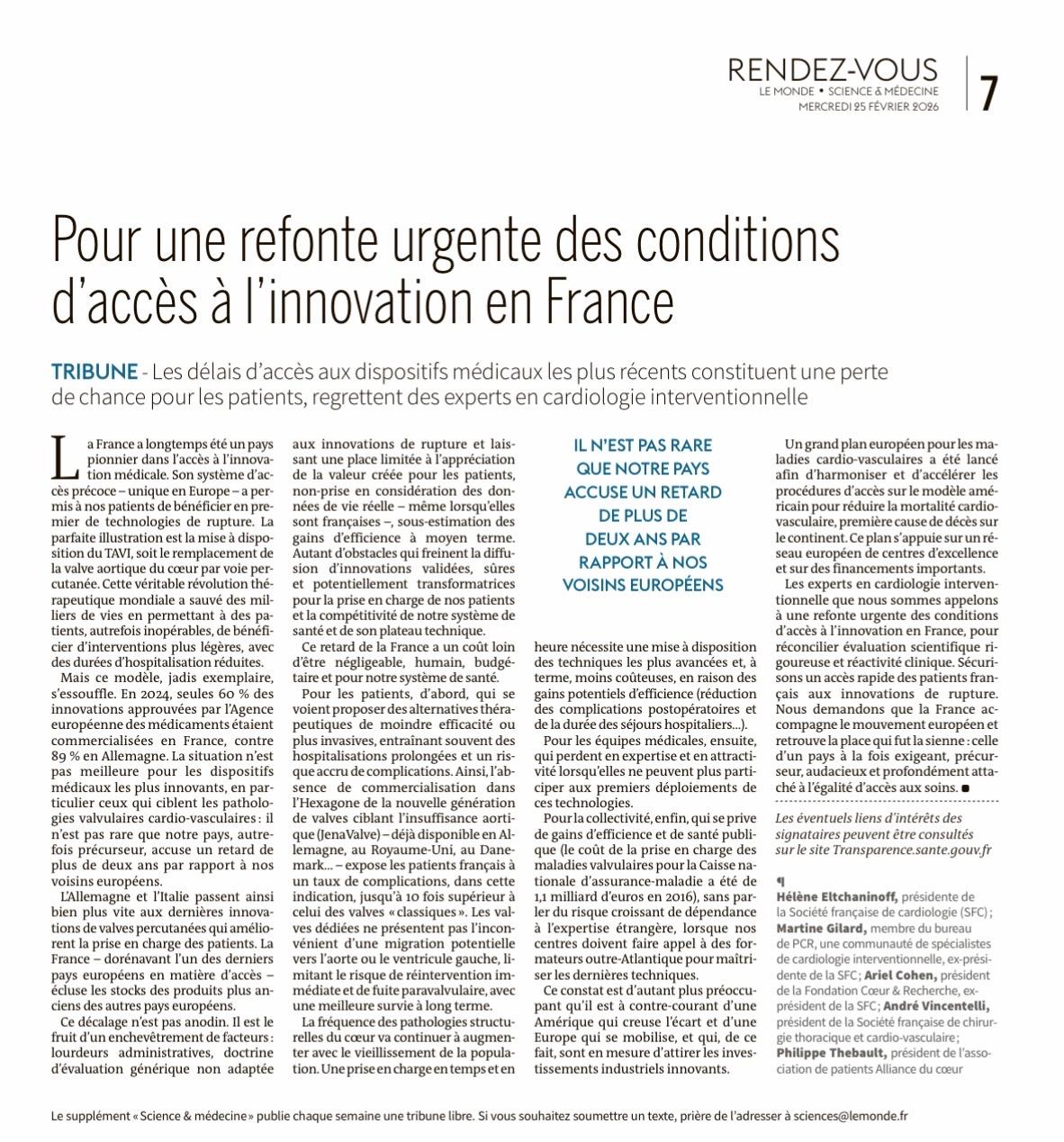 Dans une tribune publiée dans l’édition du Monde du 25 février 2026, des experts en cardiologie interventionnelle, dont le professeur Ariel Cohen, président de la Fondation Cœur & Recherche, alertent sur les délais d’accès aux dispositifs médicaux les plus récents, qu’ils estiment constituer une perte de chance pour les patients.
